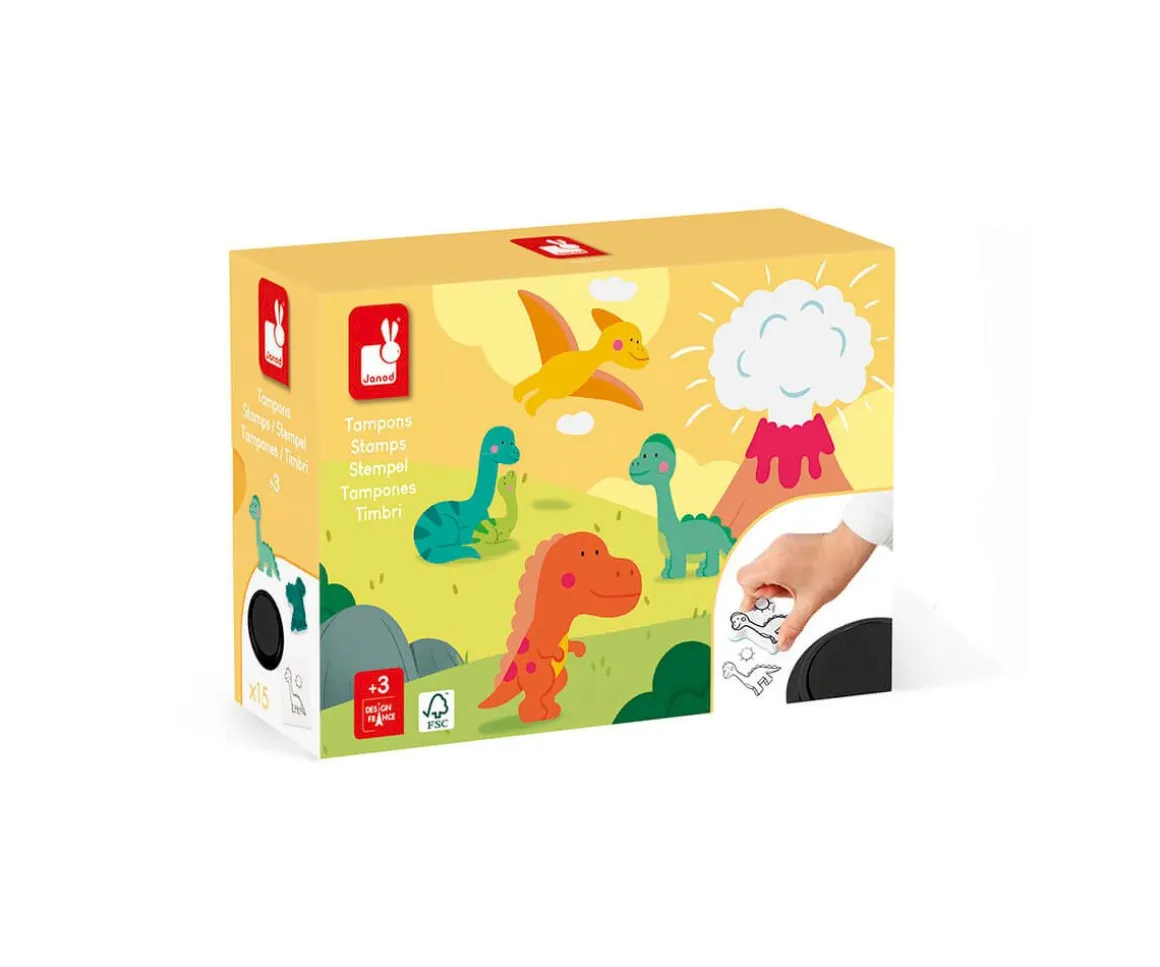 Grrrrr… Deja que tu pequeño explorador conozca a los dinosaurios. Diplodocus, Tyrannosaurus rex, huellas, volcán, rocas y árboles le están esperando para crear un mundo nuevo. Estos 15 sellos de espuma son perfectos para desarrollar la motricidad fina y la imaginación.