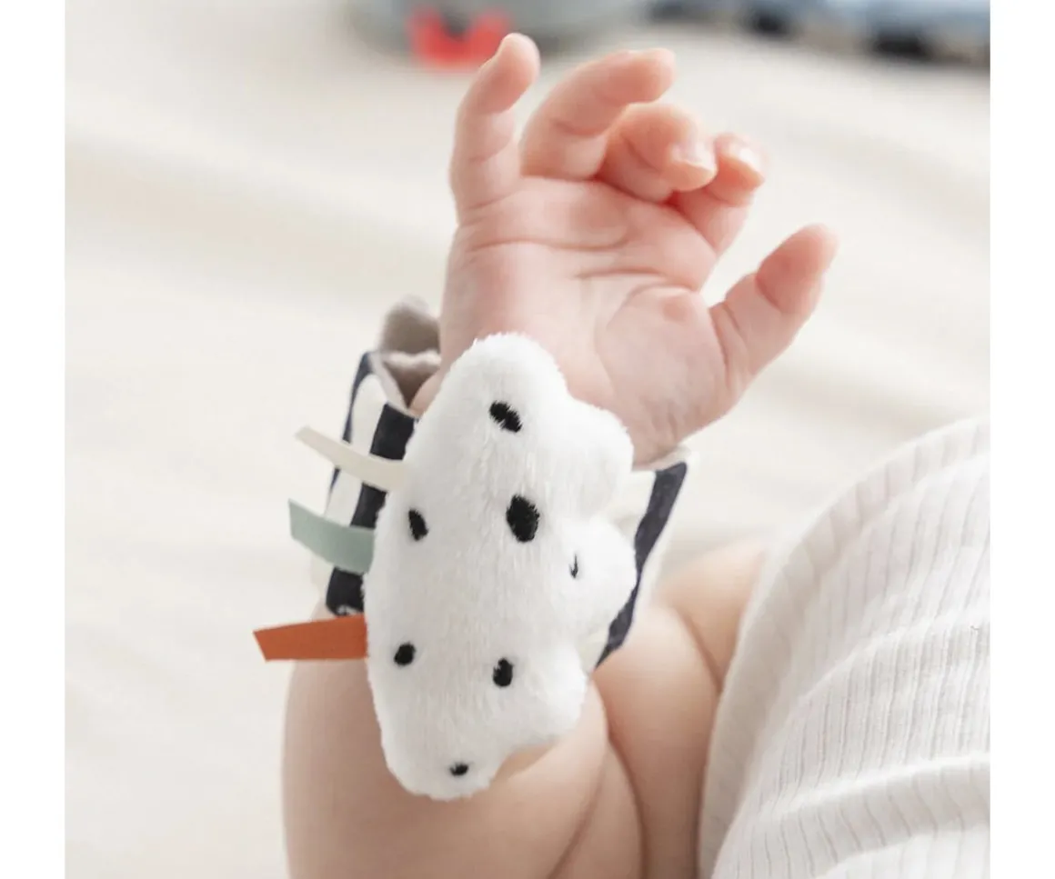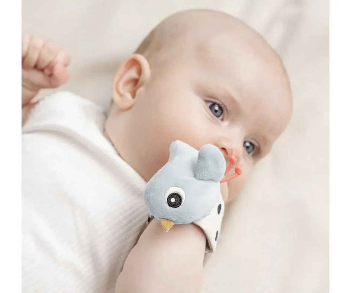 Un pulsera está decorada con lunares y el dulce pajarito Birdee azul, la otra con rayas y una suave nube de lunares y cintas que estimularán el tacto del peque. Ambas se cierran con velcro para poder colocarlas en muñecas o tobillos.