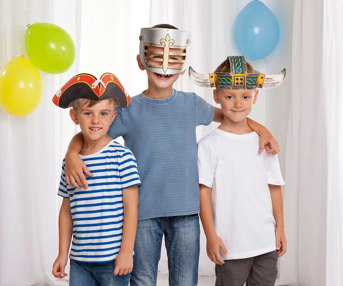- Incluye 3 sombreros de cartón para colorear (pirata, vikingo, caballero)