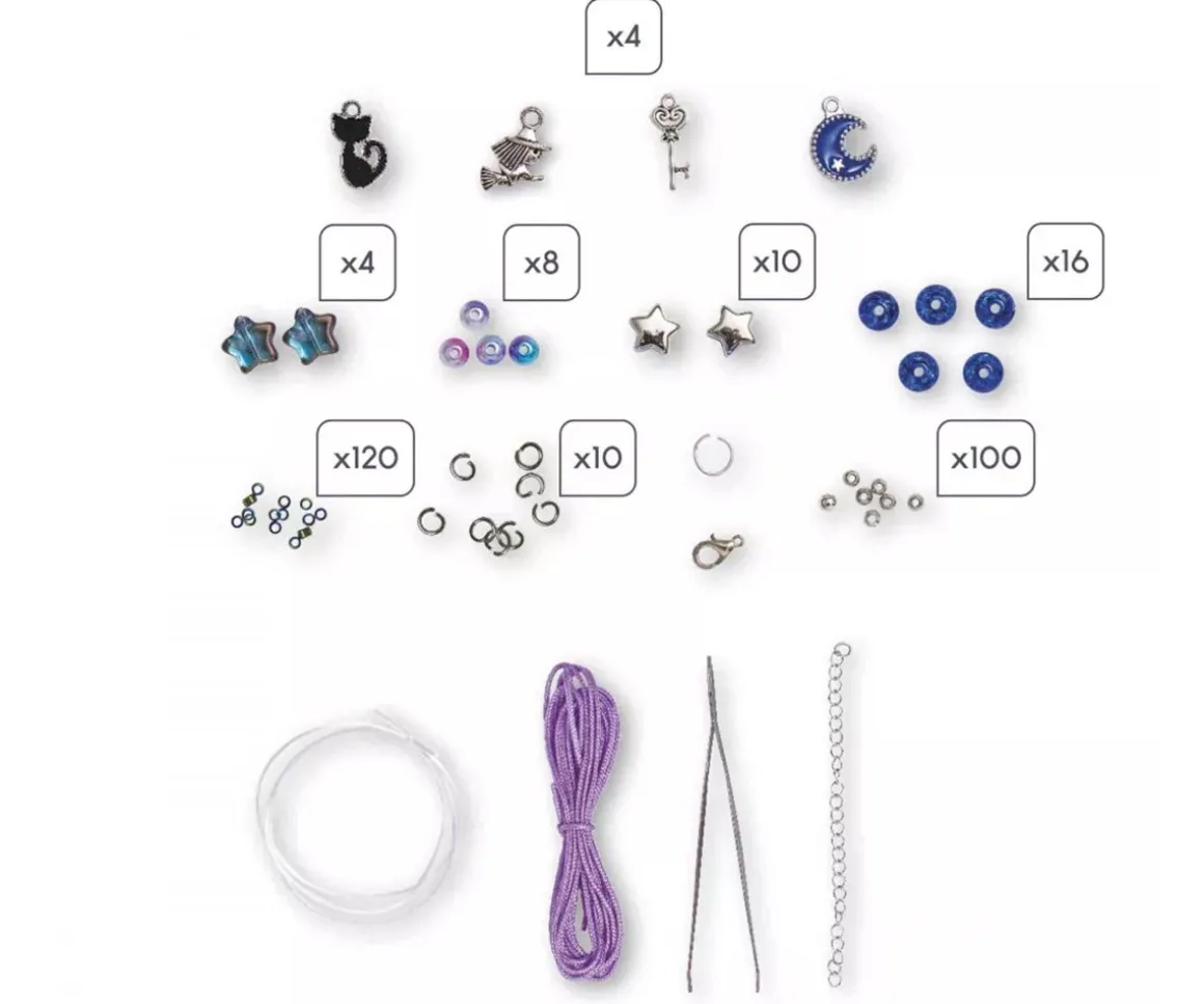 - Esta caja creativa contiene: 120 cuentas iridiscentes, 100 cuentas plateadas, 16 cuentas craqueladas, 8 cuentas perladas, 10 cuentas estrella plateadas, 4 dijes (gato, luna, llave y bruja), 4 cuentas estrella iridiscentes, 10 anillos de conexión, 1 conector grande anillo, 1 cierre, 1 hilo elástico, 1 hilo de jade, 1 cadena de plata y 1 clip