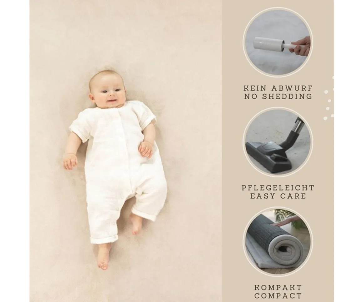 La alfombra infantil nube está formada por 3 capas: una capa de terciopelo coral para un contacto más suave con la piel, otra capa de espuma viscoelástica de alta densidad para jugar y gatear cómodamente y su parte de abajo antideslizante para proteger contra golpes al caerse.