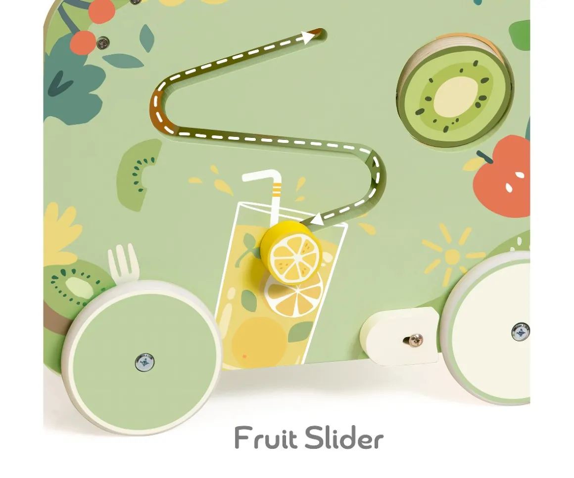 En un lateral cuenta con un clasificador de formas, el peque tendrá que encajar cada verdura en su forma correspondiente. Además podrás encontrar, una barra con anillas y un laberinto en otro de sus lados.