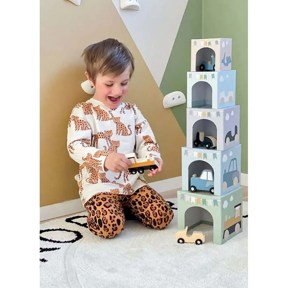 Un completo juego de cubos que alterna el equilibrio para conseguir apilarlos sin que se caigan junto con la habilidad de aparcar los vehículos dentro de cada cubo. De colores muy dulces también cuenta con números dibujados que servirán de ayuda para aprenderlos.