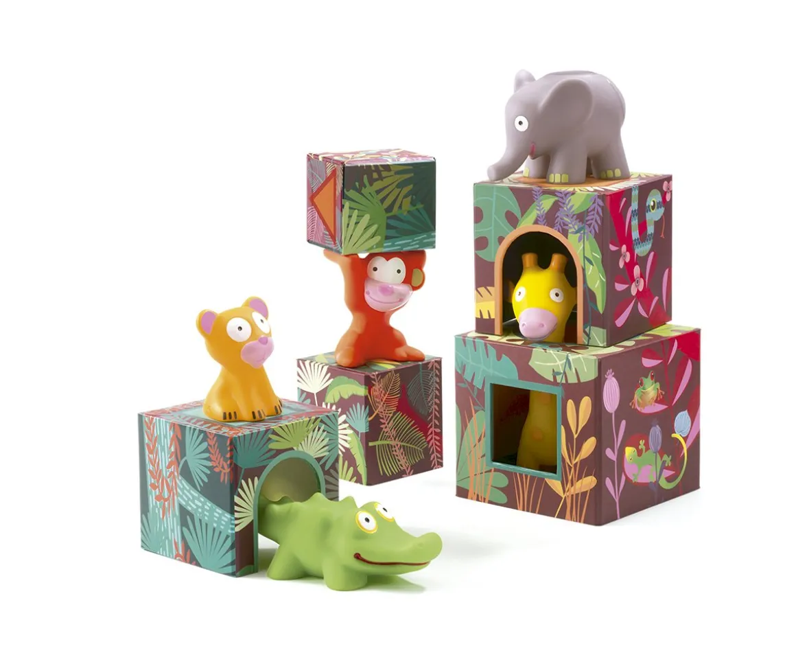 - Incluye: 5 cubos apilables y 5 animales (jirafa, cocodrilo, elefante,mono y leoncito)