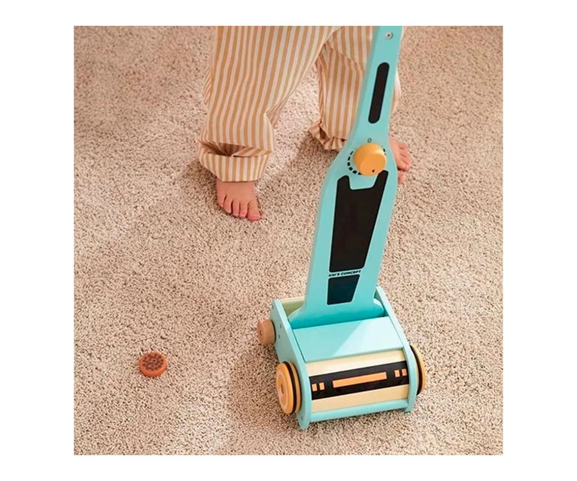 Aspiradora de madera mint retro con discos magnéticos de suciedad. Un set completo que cuando haces rodar la aspiradora atrapa los discos magnéticos y los deja en un compartimento interno que puede vaciarse para limpiar.
