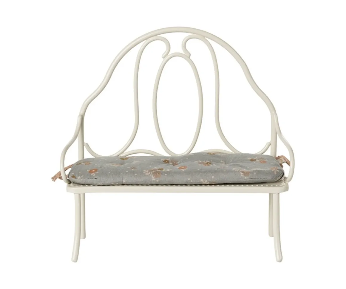 El precioso banco vintage de Maileg, perfecto para los conejitos de la talla 1 y 2, será un lugar perfecto para poner a descansar a tus pequeños amigos gracias al cojín suave que incluye.