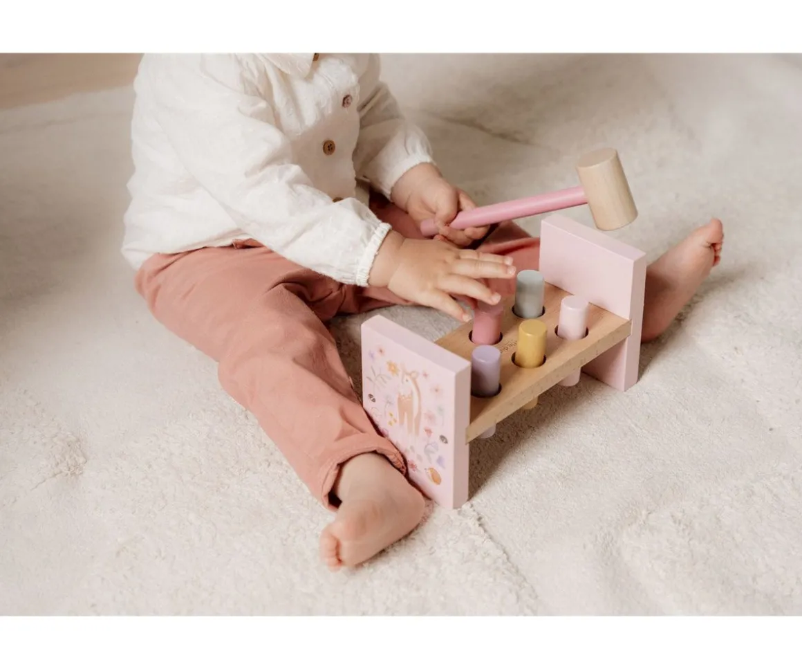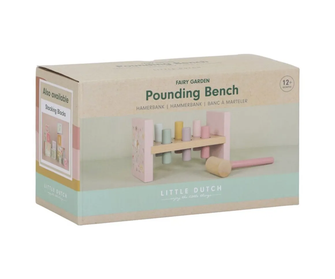 Usa el mazo para golpear las 6 clavijas de colores en el banco de madera y explora la magia de la colección Fairy Garden de Little Dutch. Una vez terminado de golpear todos los colores, ¡gira el banco y comienza de nuevo!