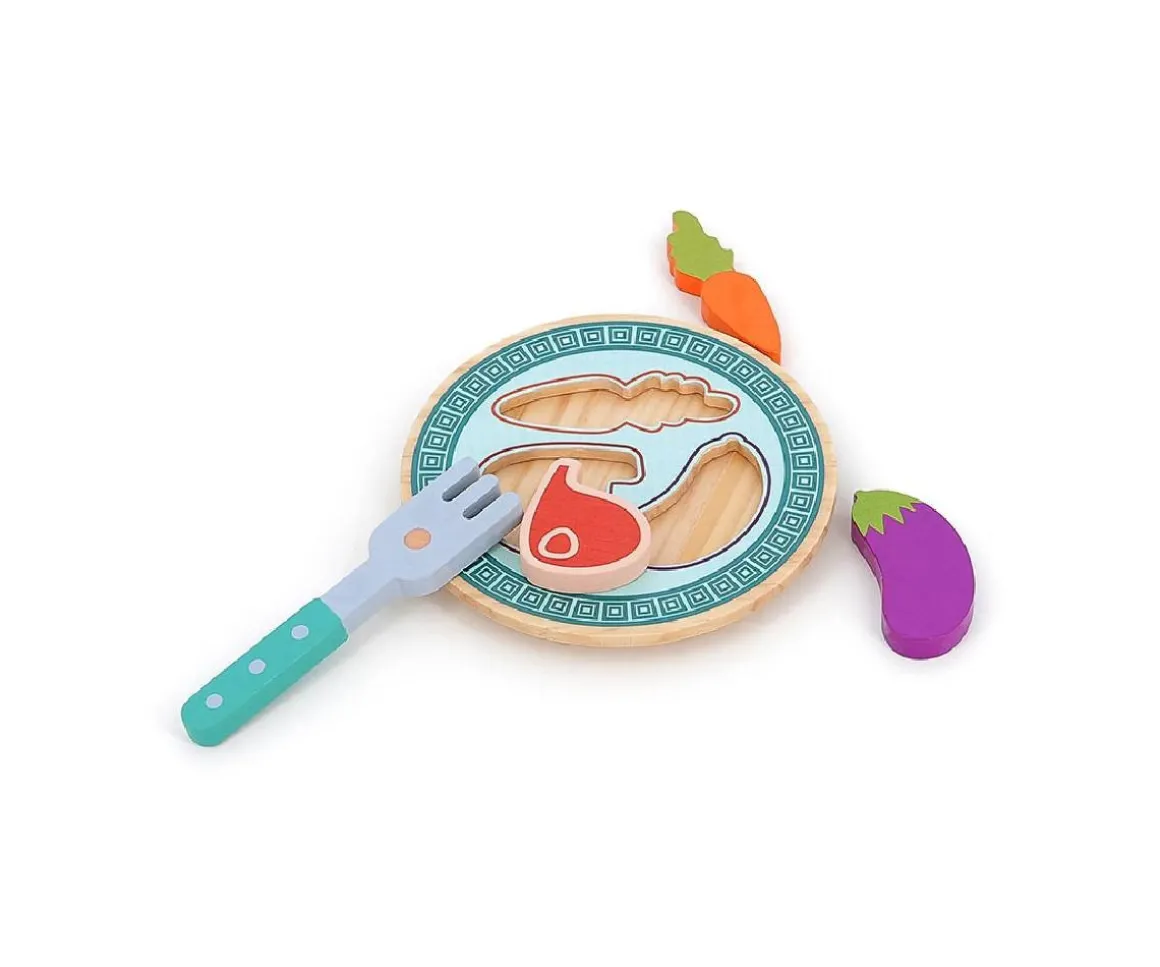 - Incluye: tabla de madera, 1 pera apilable, 1 pan para cortar a rebanadas, laberinto en forma de helado, 1 vaso de agua sonajero, cubiertos y platos encajables en la base y 3 alimentos encajables puzzle plato