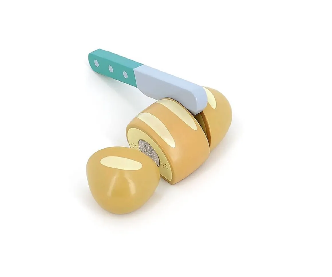 Esta bandeja de madera incluye una bebida con sonajero, pan para cortar con el cuchillo, alimentos encajables y una pera apilable. Perfecta para desarrollar habilidades motoras con colores vivos y un tamaño ideal para los más peques.