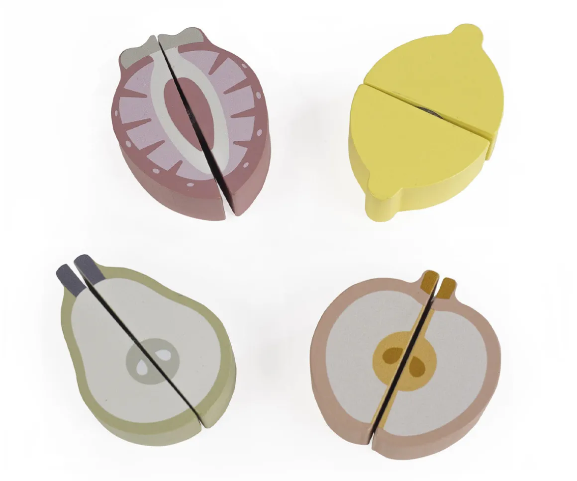 - Incluye la batidora, una taza, una cuchara y una variedad de frutas de madera (plátano, pera, fresa y manzana) que se pueden «cortar» por la mitad gracias a su diseño con velcro