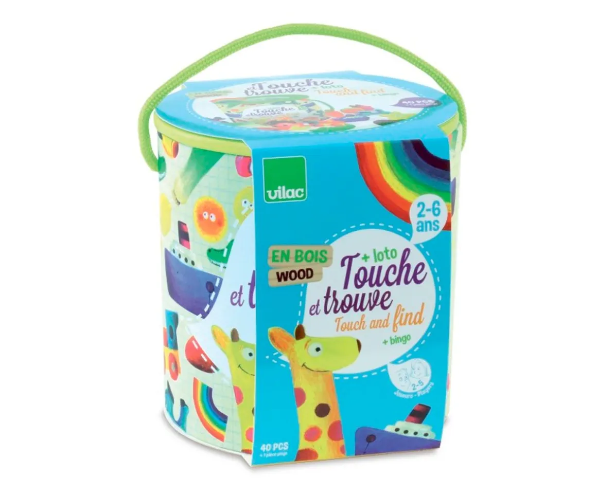 Juego de reconocimiento táctil que consiste en meter la mano en la bolsa para encontrar las piezas que necesitas. El juego incluye 21 piezas de madera que incluyen una pieza truco y 20 cartas ilustradas. Además, puede usarse como bingo.