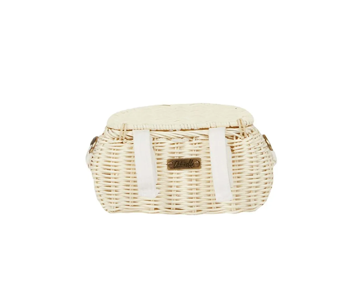 Tejido a mano de ratán con una pequeña tapa, con trabillas de lona regulables (para ponerlas a patinetes o bicicletas) y una correa larga ajustable con herrajes de latón para llevar colgado.