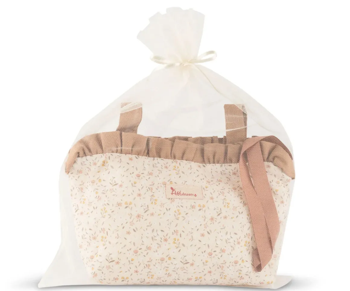 Encantadora bolsa panera, diseñada especialmente para los carritos de muñecos. Su diseño versátil permite utilizarla también como bolso bandolera, gracias a la correa larga incluida, ideal para colgar cómodamente al hombro.