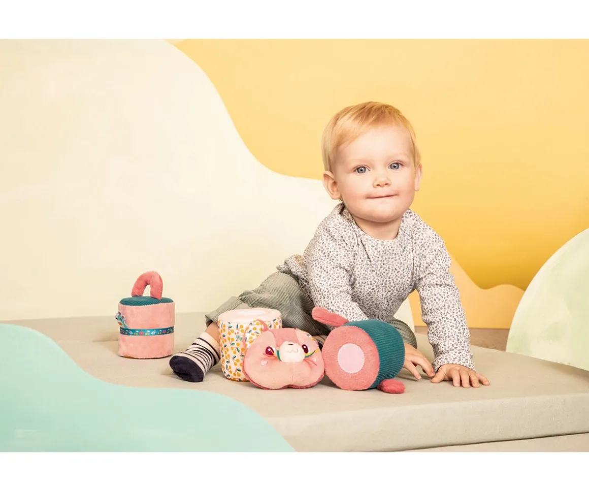 Este divertido juguete sensorial está formado por 4 cilindros blanditos. El primero es la cabecita del gatito Jeanne de Lilliputiens, el resto podrás unirlo con su velcro y formar una cadena de actividades que en su interior encontrarán sonidos estimulantes.
