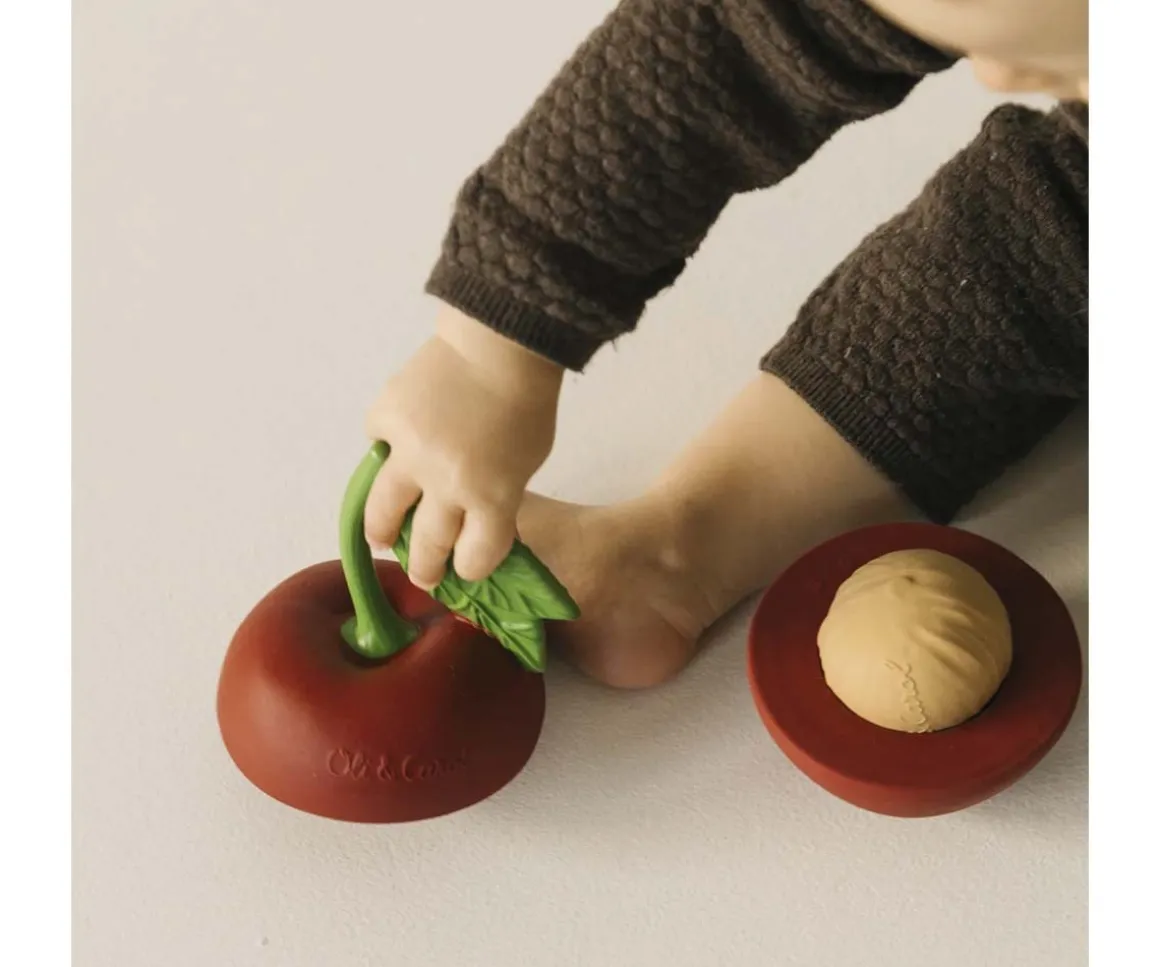 Merry the Cherry de Oli&Carol es un juguete 3 en 1: apilable, sonajero y pelota. Fabricado en caucho 100% natural y relleno de huesos de cereza, estimula los sentidos del bebé con su suave sonido al agitarlo, mientras las piezas apilables fomentan el pensamiento lógico. Además, rueda y rebota para aportar más diversión al juego.