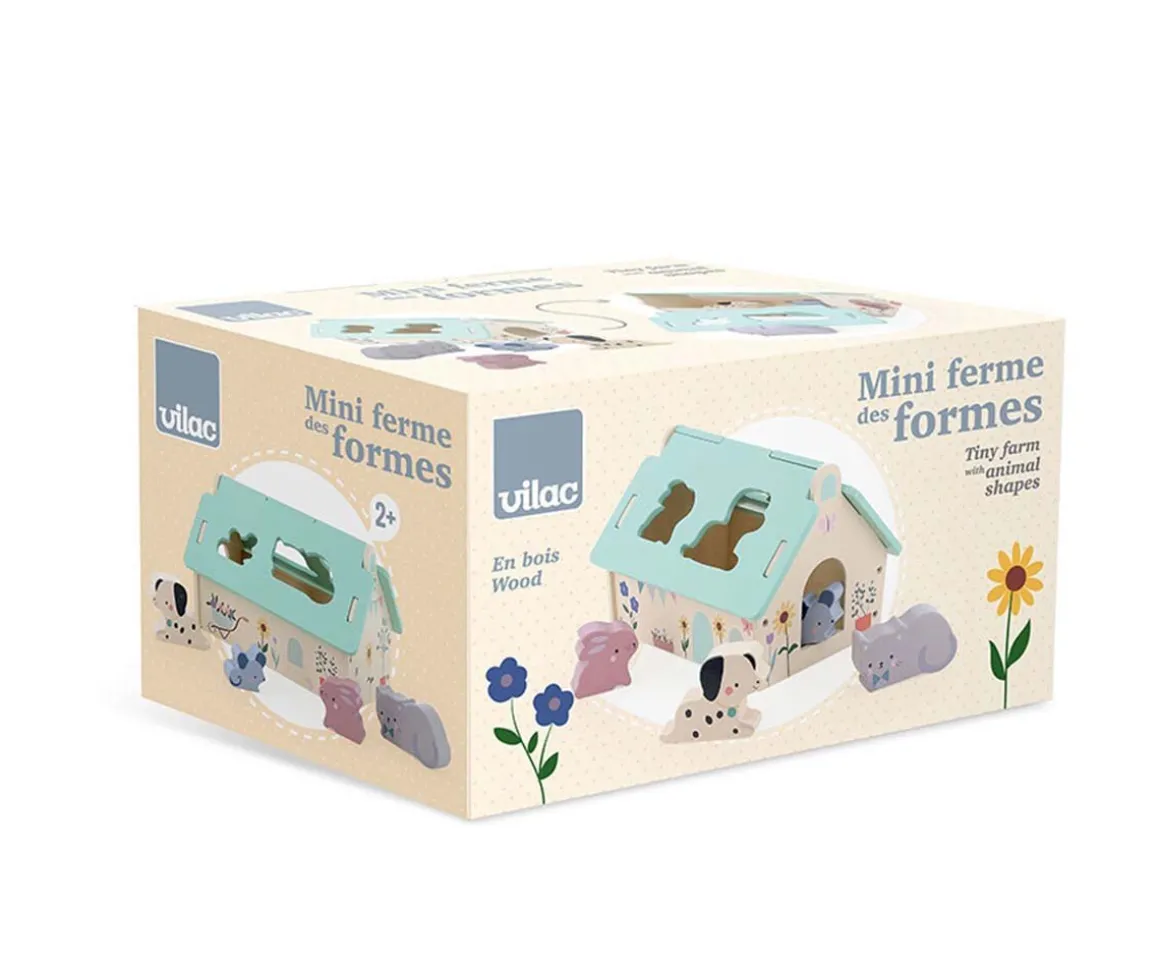 - Contenido: 1 casita de madera con formas + 4 animales: perro, conejo, gato, ratón