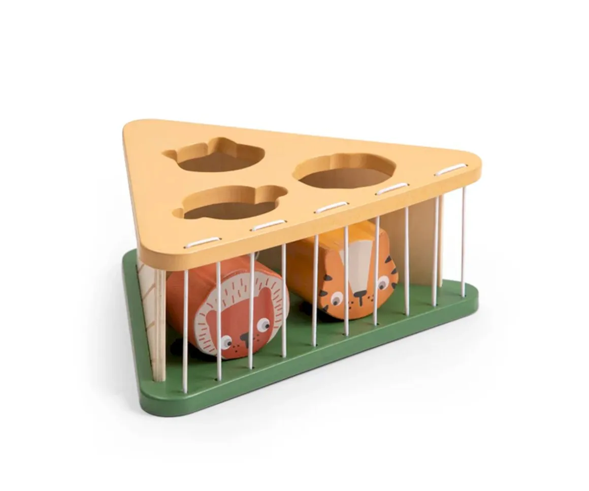 El clasificador tiene forma de triángulo y agujeros en la parte superior con la forma de trigre, león y mono.Entre las placas de madera hay un elástico resistente que simula una jaula de zoológico.