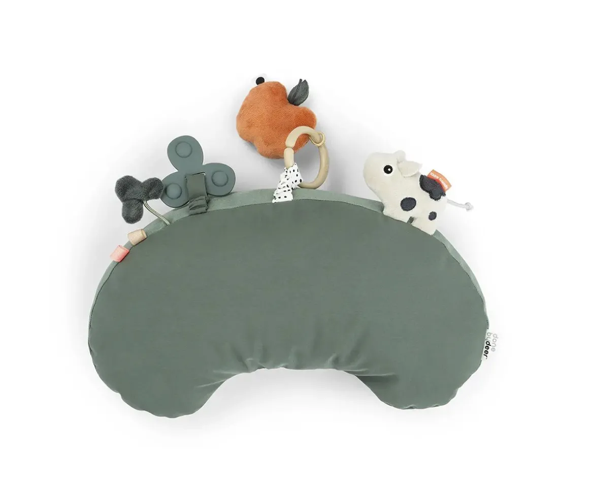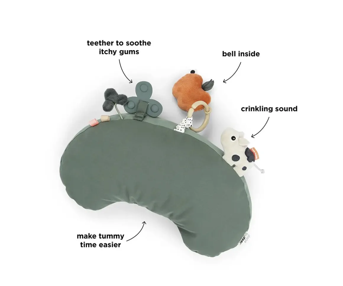 La almohada de actividades de la colección Tiny Farm de Done by Deer ayuda a fortalecer el cuello y espalda de tu bebé mientras disfruta del juego sensorial.