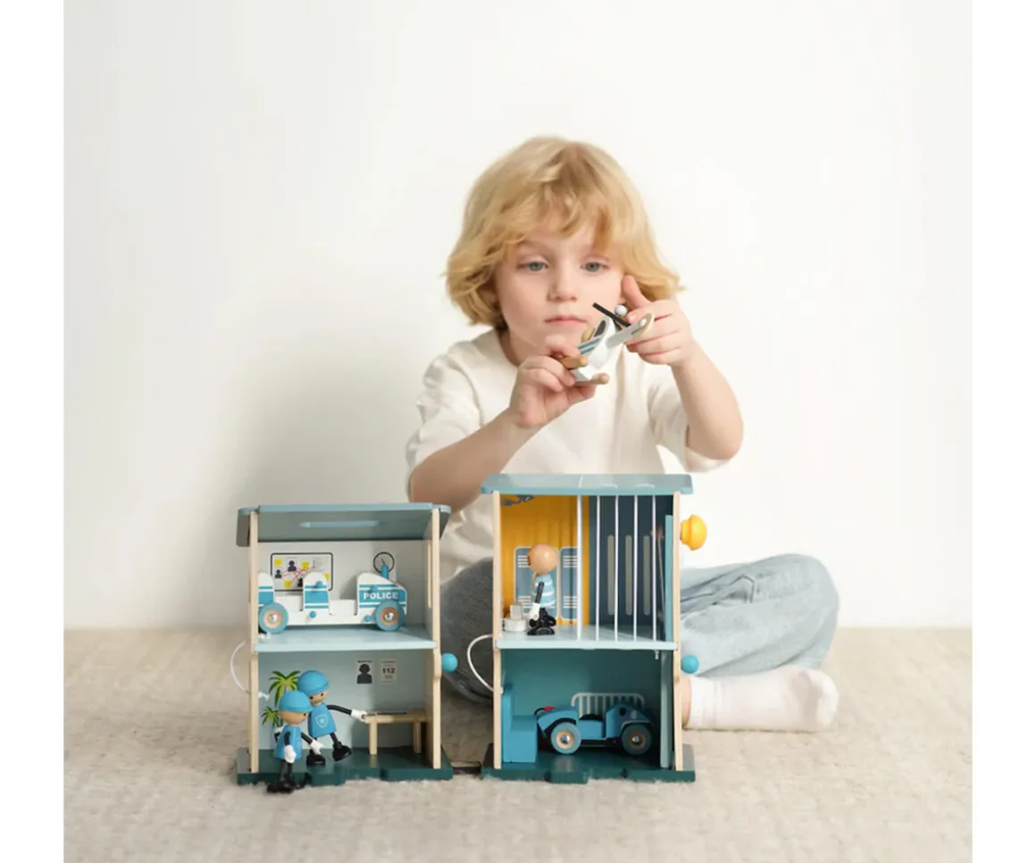 - Incluye: 11 piezas, (dos vehículos, agentes, una zona de recepción, una sala de detectives, una cárcel)