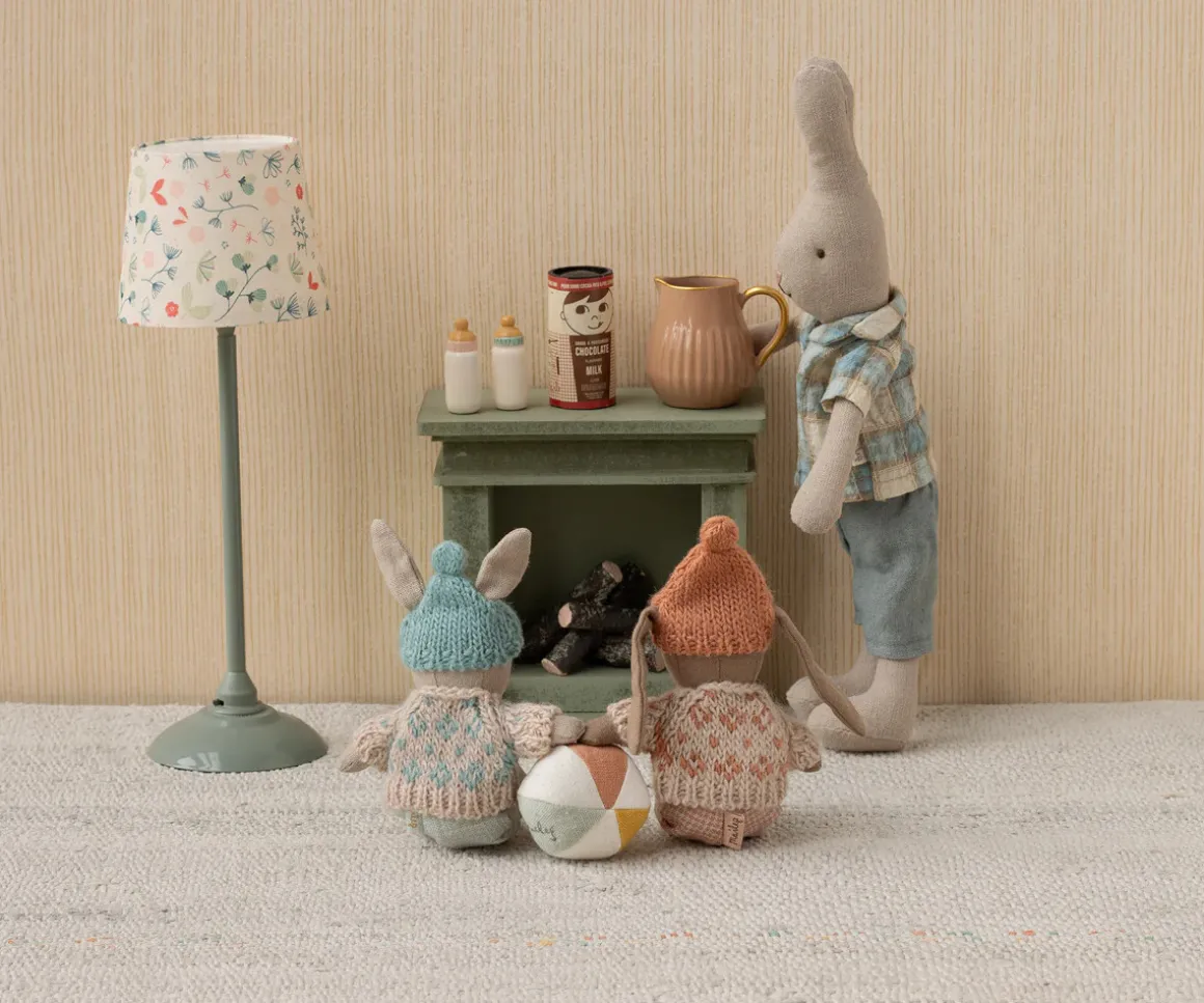 Est pequeño conejito lleva puesto un conjunto de punto acompañado de un gorrito y es perfecto para los accesorios Maileg de tamaño micro.