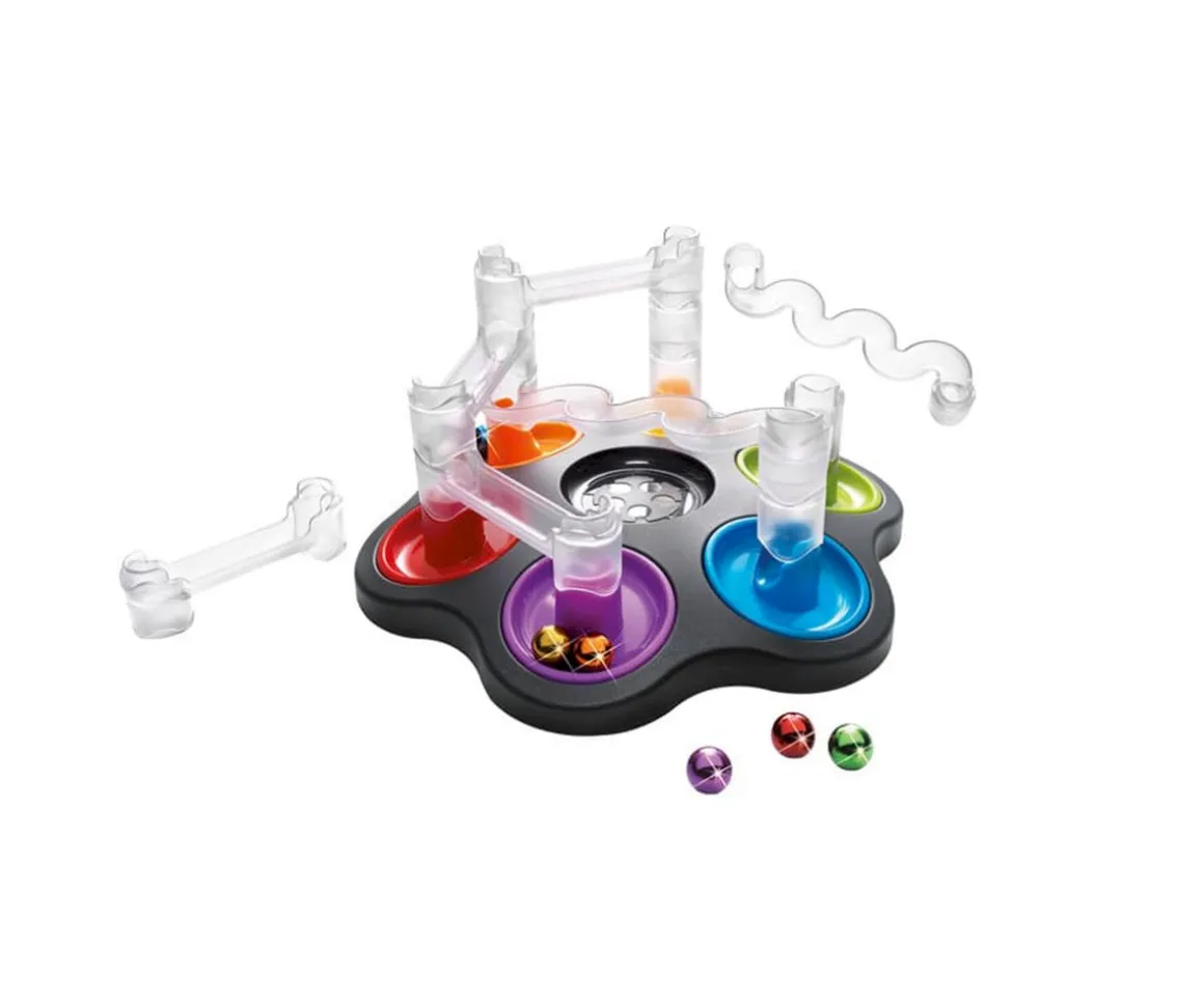 - Incluye: 1 tablero con 6 bases, 6 canicas, 2 espaciadores, 5 rampas cortas, 2 rampas largas y 1 tarjeta de desafíos