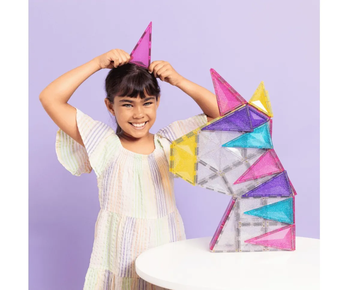 El Glitter Unicorn Pack de 56 piezas de Connetix es un set mágico de construcción con imanes que enamora desde el primer destello. Diseñado para amantes de los unicornios, soñadores de fantasía y pequeños exploradores creativos, este pack está repleto de piezas translúcidas con purpurina en tonos vivos de rosa, amarillo, turquesa y morado.