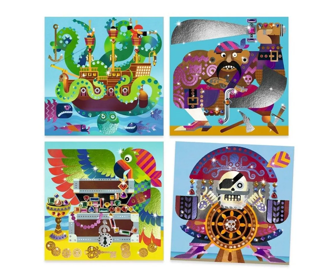 4 cuadros ilutrados prepegados con temática de piratas que tendrás que revelar mediante una herramienta de plástico, un surtido de láminas de colores texturizadas para pegar y pegatinas de pedrería para decorar.