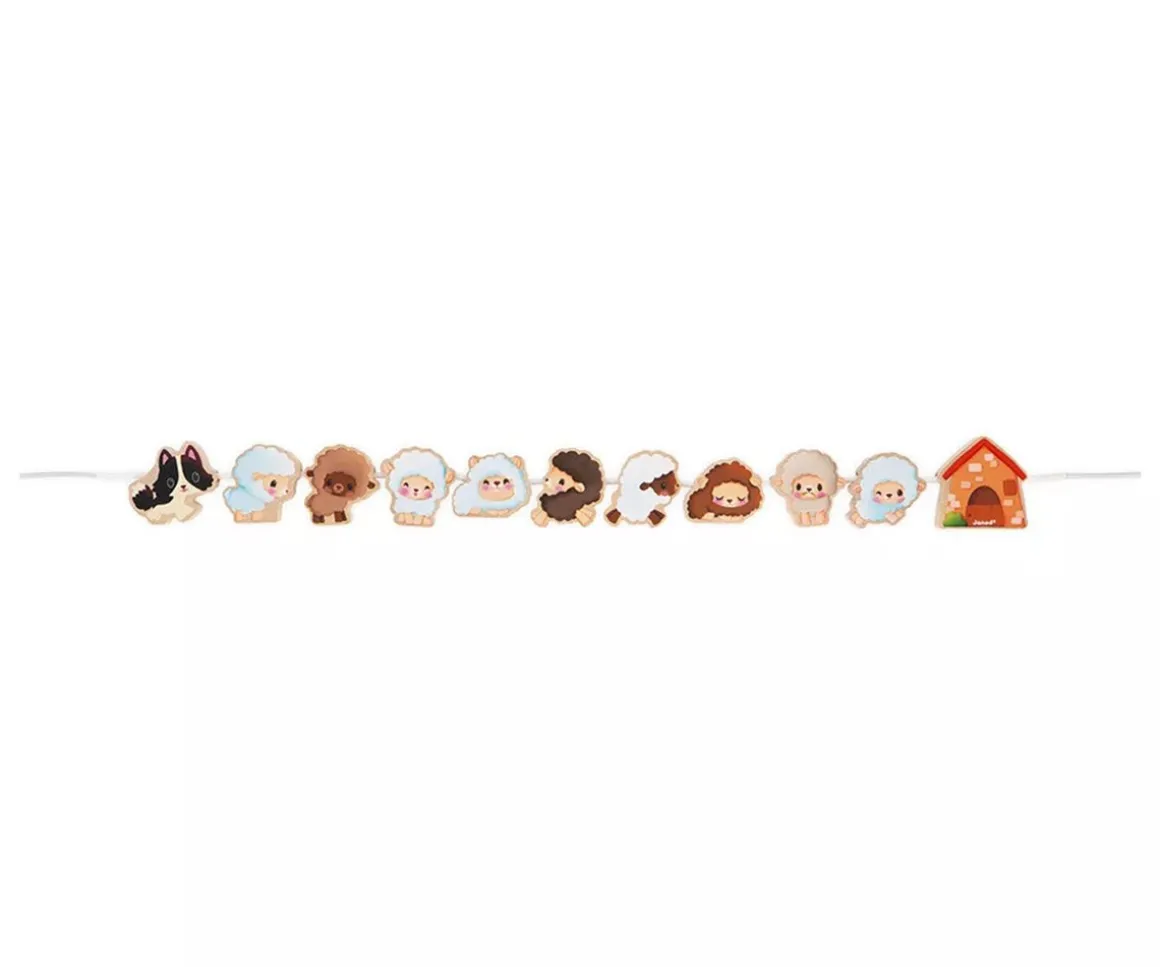 - Incluye 11 piezas (9 ovejas, 1 perro y 1 casita) y 2 cordones