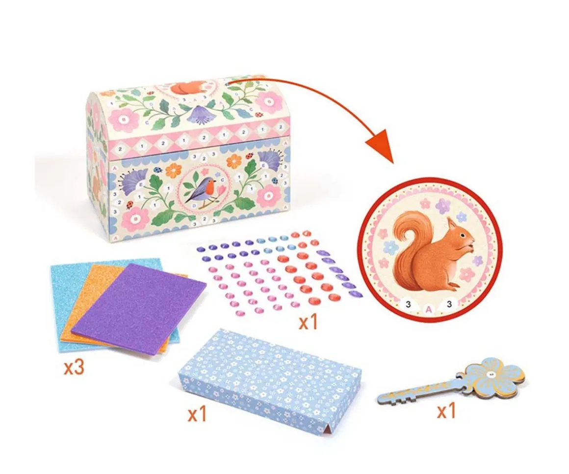- Contenido: cofre del tesoro, una llave, 3 láminas de mosaicos autoadhesivos con purpurina, 1 lámina de pegatinas, instrucciones paso a paso