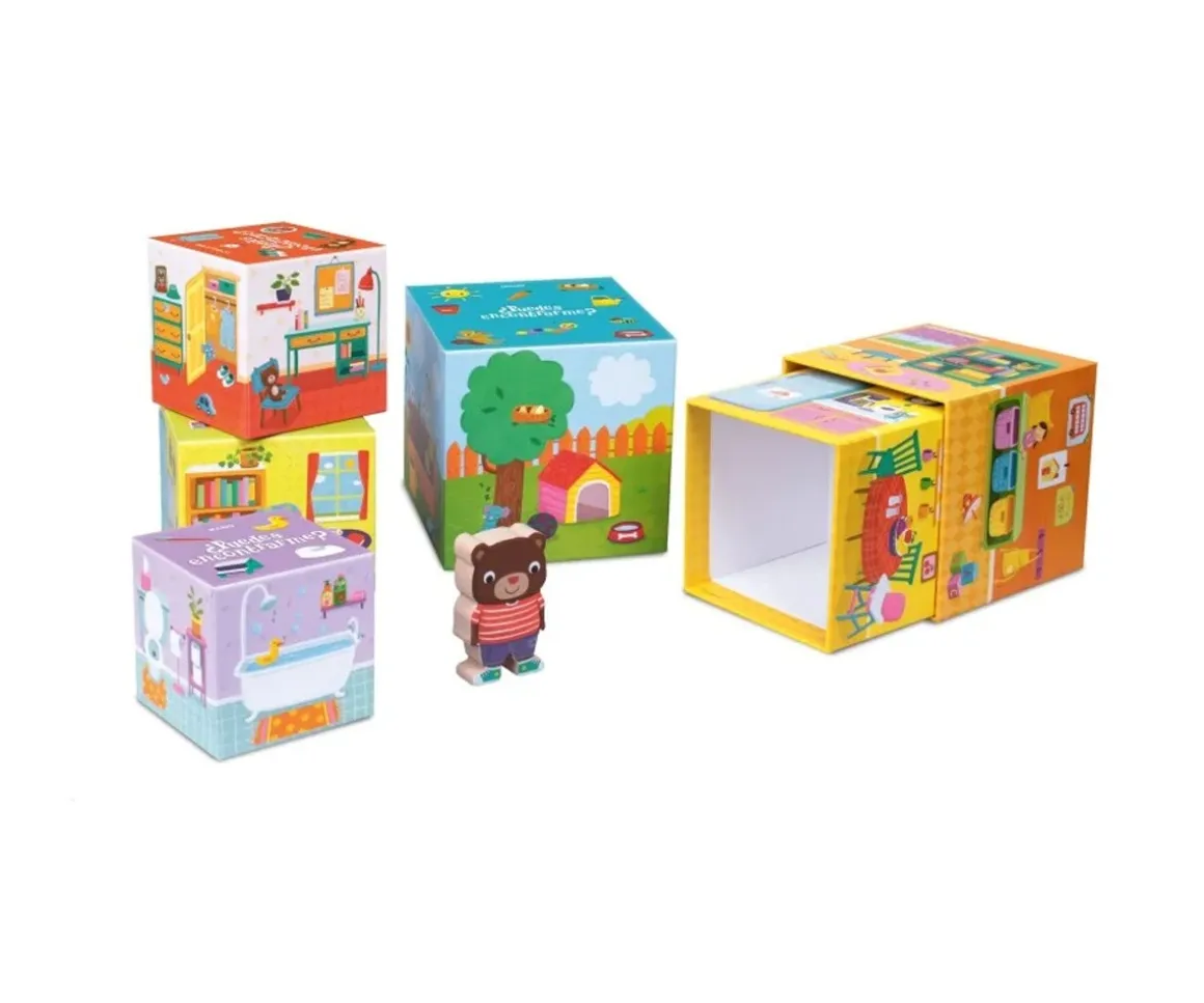 Los bloques apilables simulan las diferentes estancias de la casa de Oso, los peques deberán buscar entre las estancias para encontrarlo.