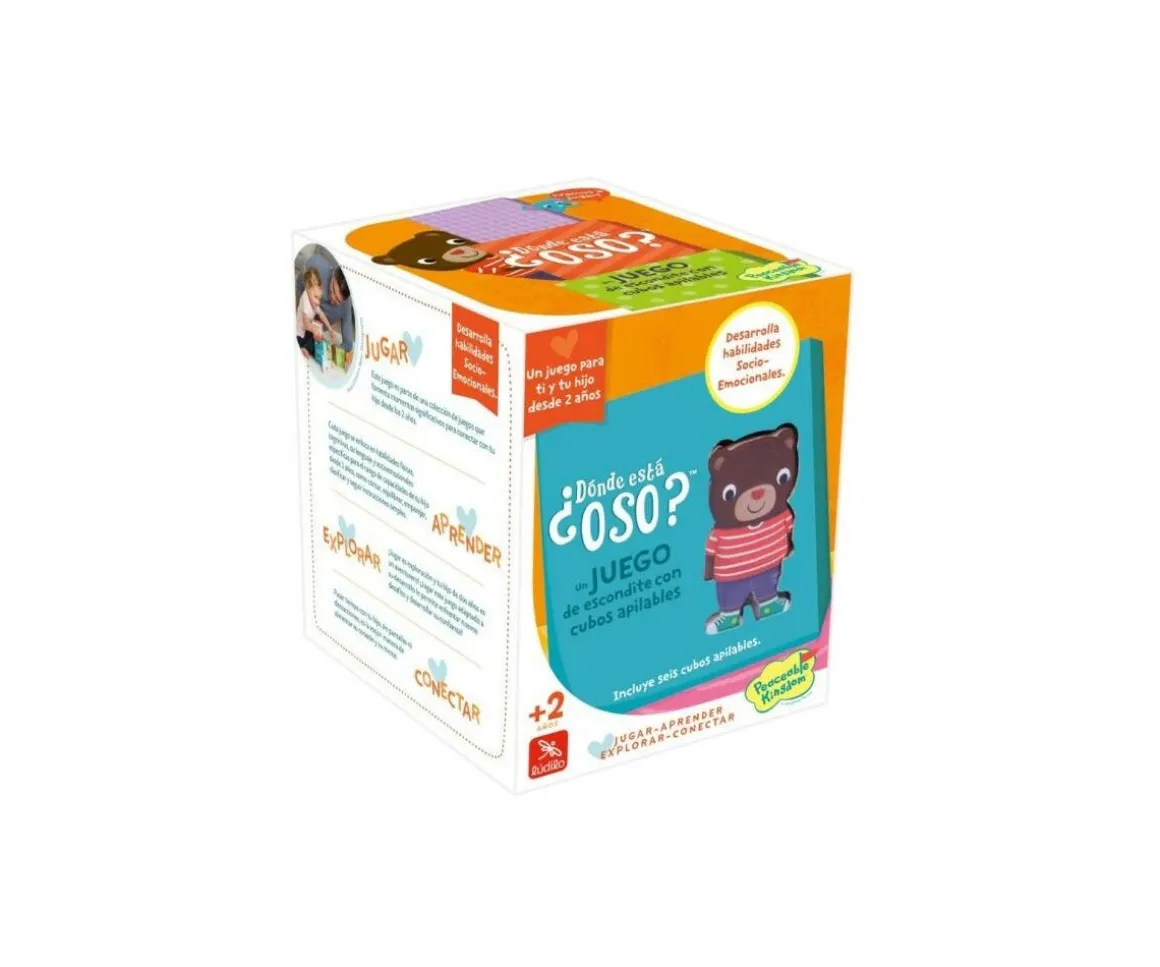 - Incluye: 6 cubos apilables ilustrados de cartón grueso, 1 pieza osito de madera