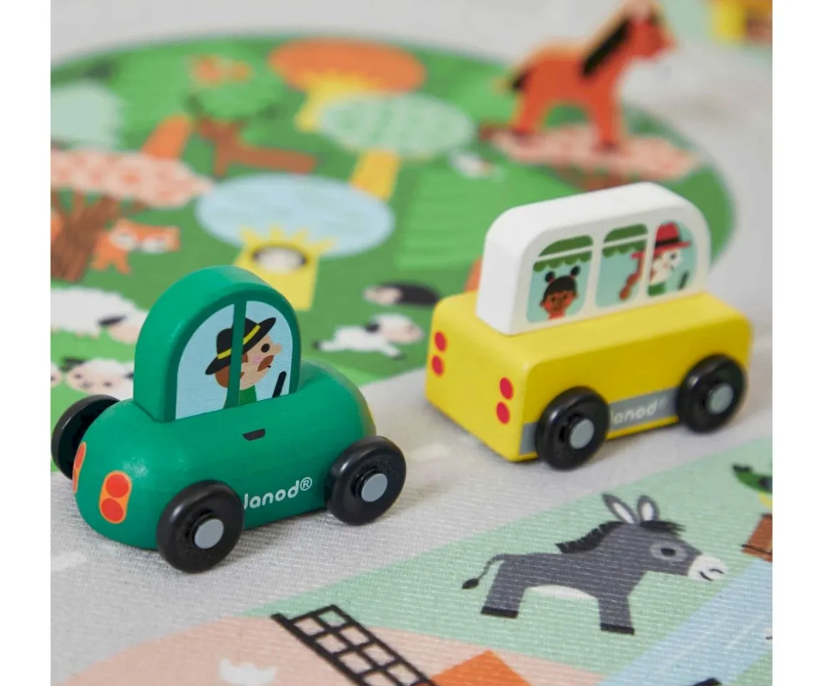 La colección está formada por una serie de alfombras de juego con circuitos ideales para que los vehículos de madera los transiten y decorarlos con los cubos de madera de Janod.