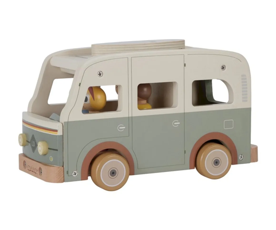 Esta original furgoneta de madera es genial para pasear a los muñecos encajables de su interior y sus accesorios. Podrás levantar el techo de la furgoneta.