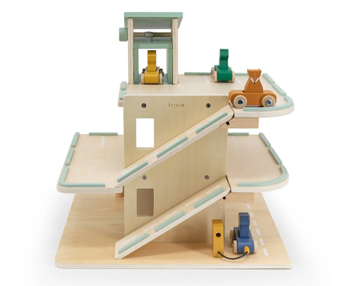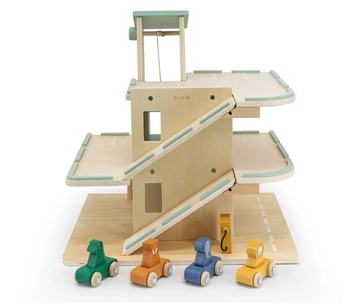 Los animales de Trixie están buscando un lugar para estacionar su cochecitos. Suben a la azotea del garaje utilizando el ascensor.