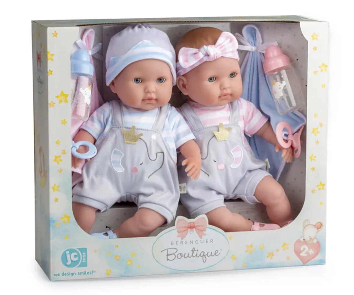 - Incluye: 2 muñecos, 2 conjunto de ropa, 2 mantitas, 2 biberones, 2 pares de zapatos y 2 chupetes