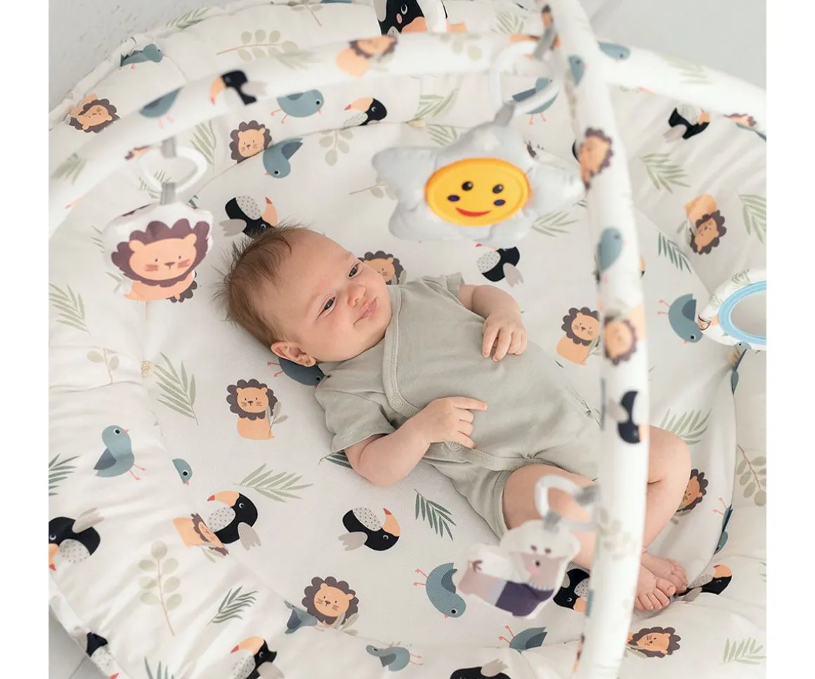 La alfombra de actividades Lion de Olmitos, es reversible, con arcos y ha sido diseñada para acompañar a tu pequeño desde sus primeros días. Además de estimular el desarrollo motor, visual y cognitivo; también proporciona un espacio acogedor y seguro gracias a sus laterales acolchados. Con los arcos y juguetes colgantes, tu bebé podrá disfrutar de una zona de juegos que le permita descubrir nuevas habilidades.