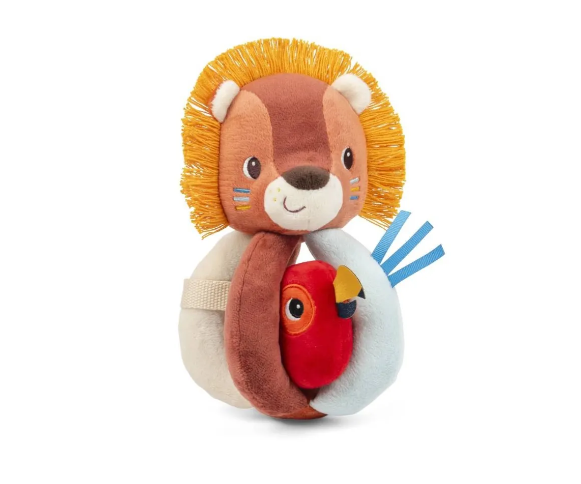 Un sonajero de lo más completo, con 5 asas de diferentes materiales para poder agarrarlo con facilidad y sensorial al tacto. El pequeño Gilles quedará sujeto en un asa para que no se pierda.