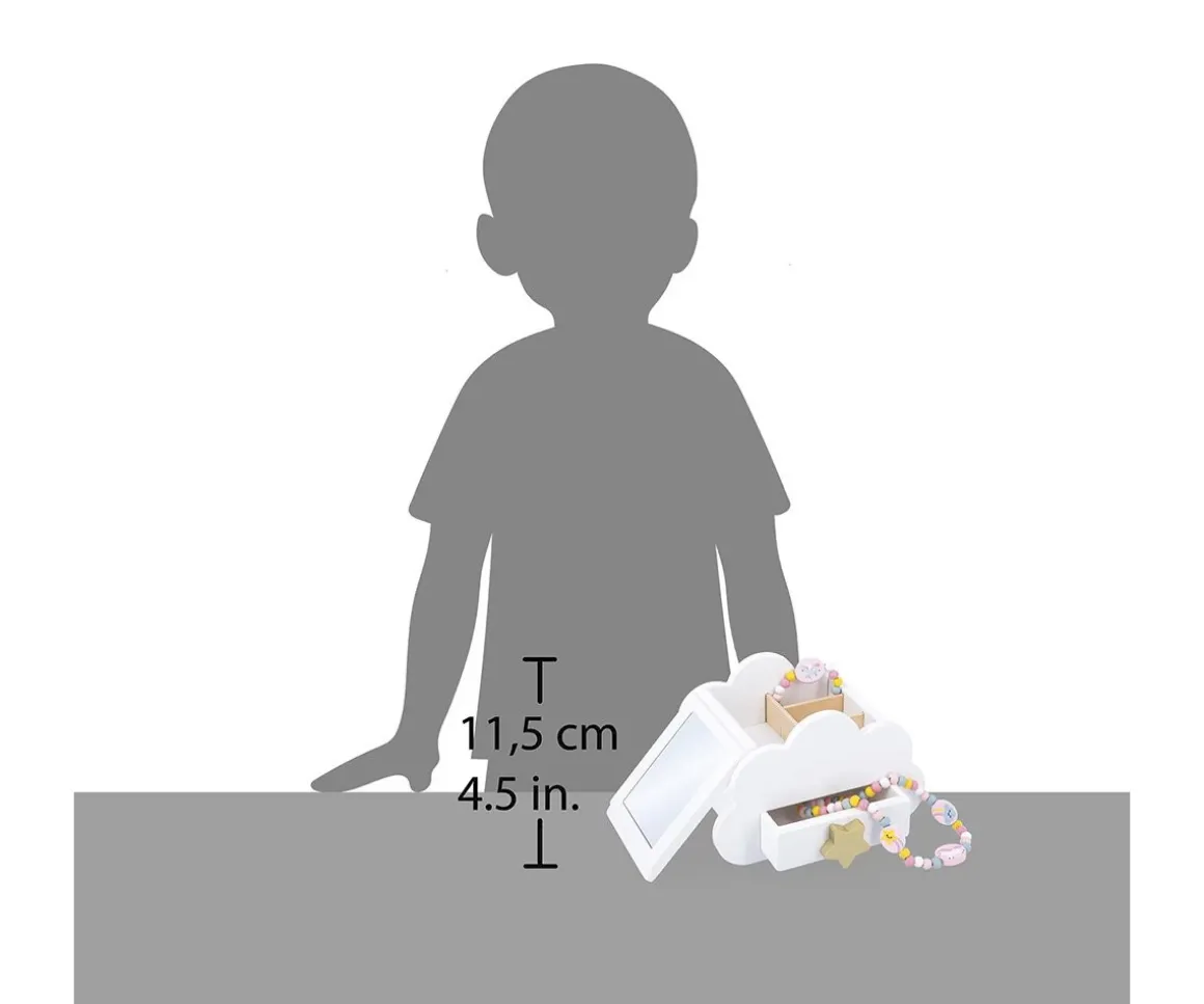 - Incluye: 1 joyero con forma de nube,1 espejo, 1 estrella magnética, 1 collar, 1 pulsera