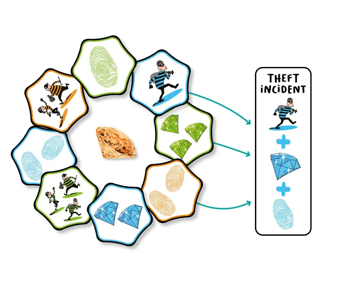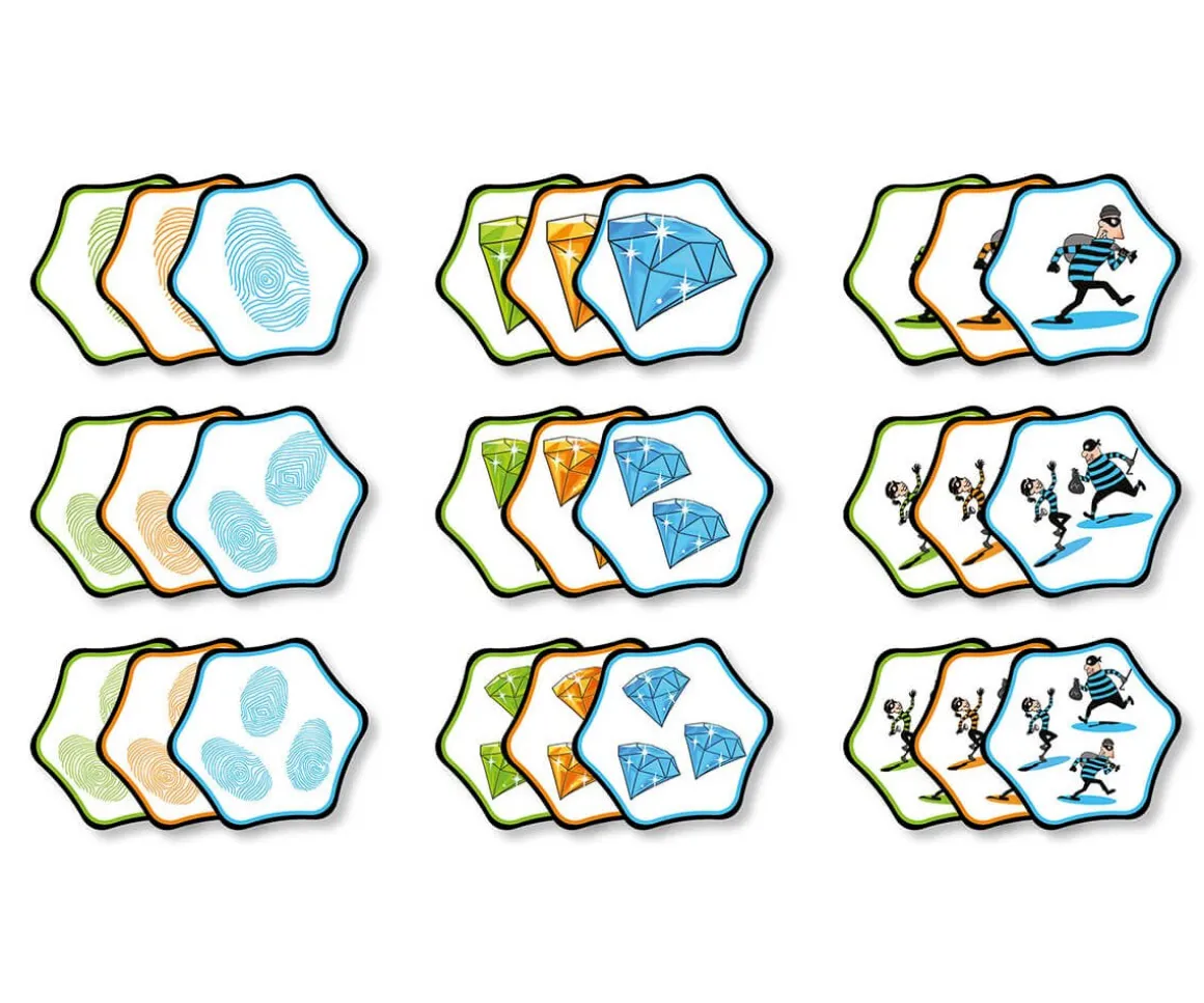 En este juego, los jugadores son guardias de seguridad y tienen que pillar a los ladrones que se han colado en el museo. Para ello, se van destapando cartas al mismo tiempo sobre la mesa y el primero que encuentre la combinación correcta de diamante, ladrón y huella, y coja el diamante, gana esas cartas. Incluye unas cartas especiales que cambian el tipo de combinación que se ha de encontrar y quién consiga más cartas al final, será el ganador.