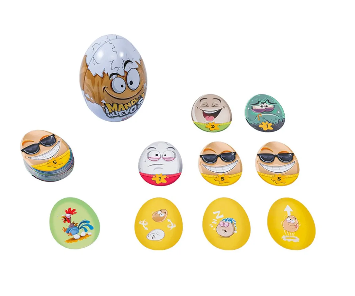 - Incluye 73 cartas ovaladas (54 cartas de huevo, 18 cartas de acción, 1 carta de gallina), reglas en español, caja de metal con forma de huevo