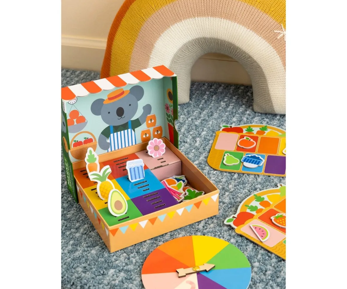 - Incluye: 4 tableros de juego, 35 tarjetas de alimentos,1 puesto de mercado, 1 ruleta, instrucciones de juego