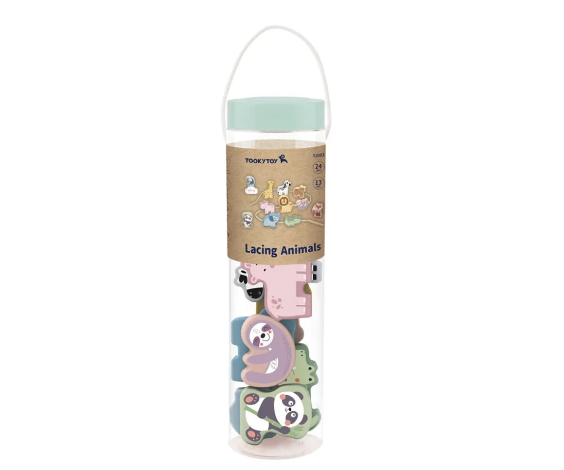 Divertido juego de enhebrar cuentas de madera con forma de animalitos perfecto para niños a partir de 2 años.