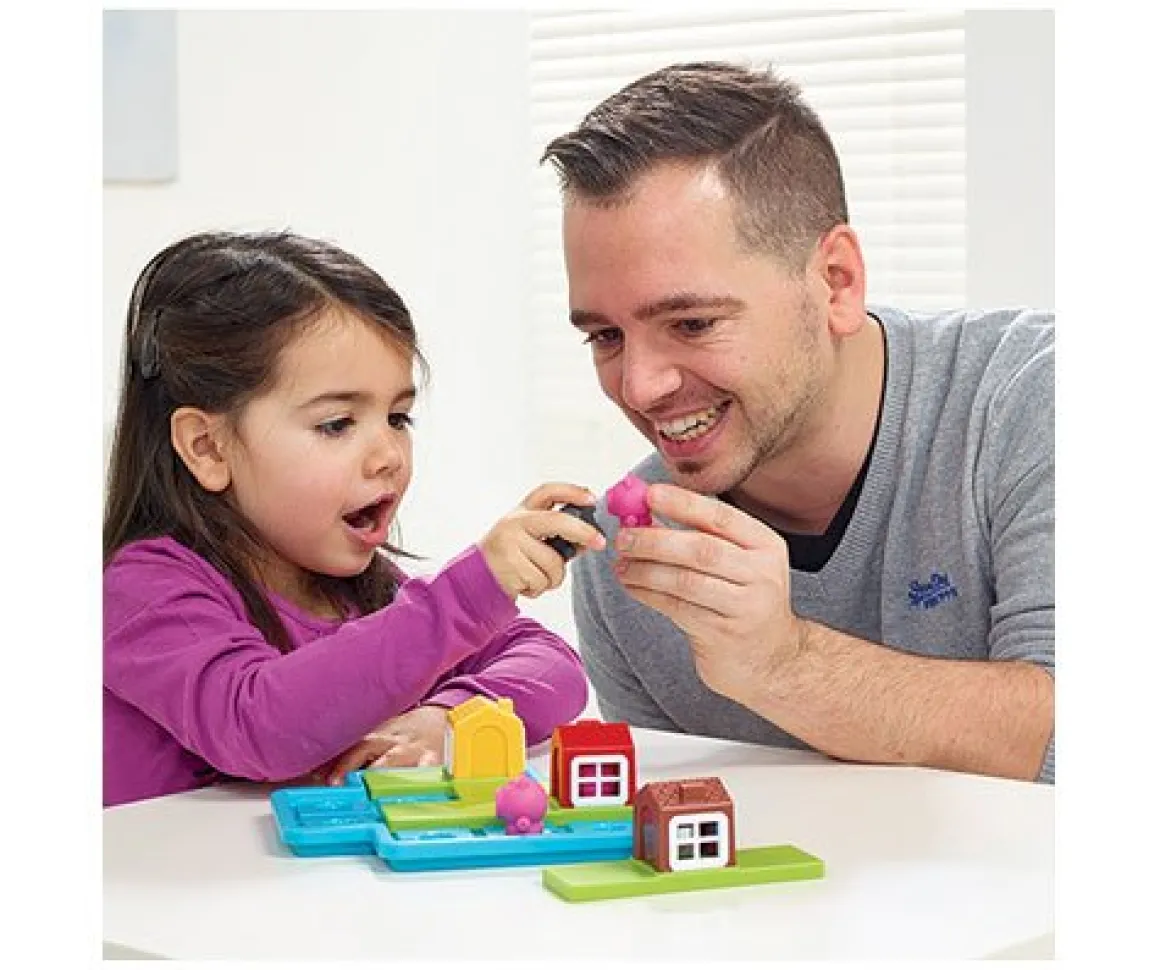 ¿Podrías ayudar a estos tres inteligentes cerditos a construir sus casas? ¿Podrías cambiarlas para que los cerditos puedan jugar fuera? Si viene el lobo, ¿podrías ayudarles a permanecer seguros dentro de sus casas? Los Tres Cerditos es un juego de ingenio perfecto para niños pequeños, ya que consiste en 3 piezas grandes, fáciles de manipular. Los niños quedan fascinados al ver como los cerditos entran en las casas y miran por las ventanas. El juego incluye un libro con el cuento en imágenes y un cuaderno con 48 retos (24 con el lobo y 24 sin él).
