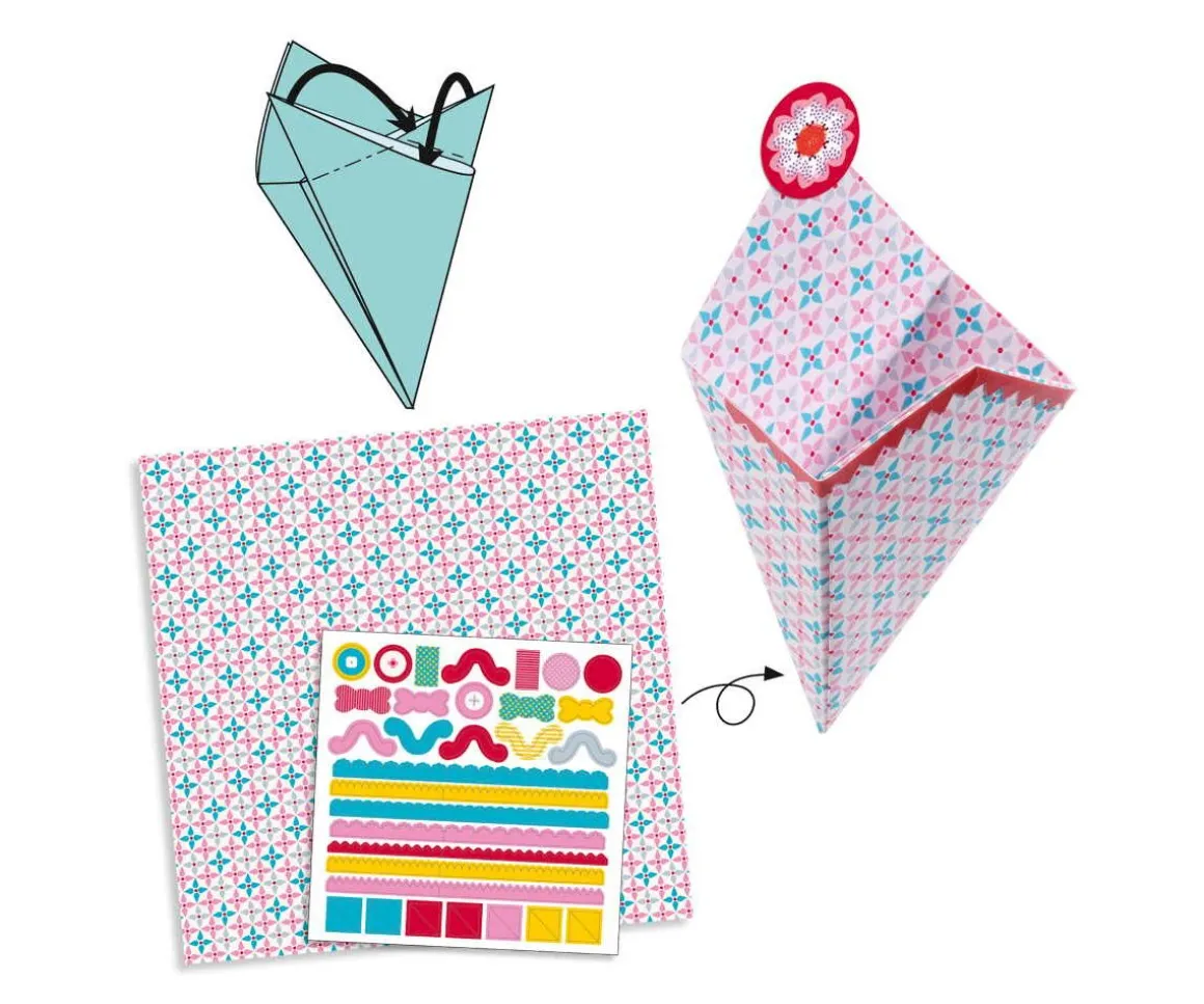 - Contenido: 24 hojas de origami, 2 láminas de pegatinas y 1 cuadernillo de instrucciones paso a paso