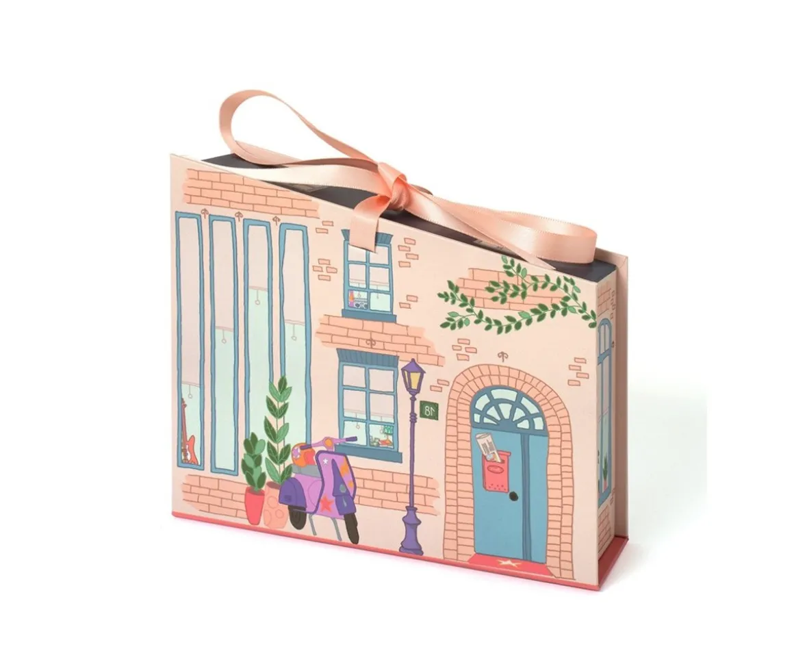 - Viene en una bonita caja decorada tipo maletín que será la estructura de la casita