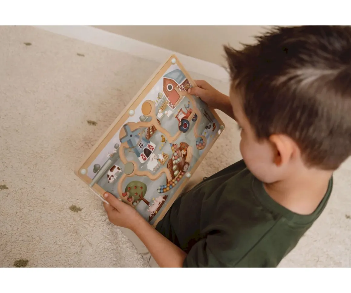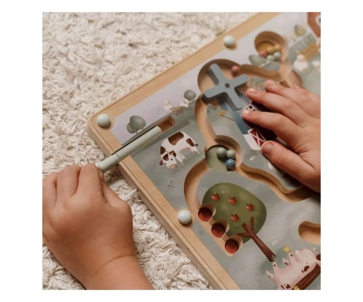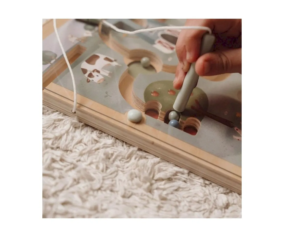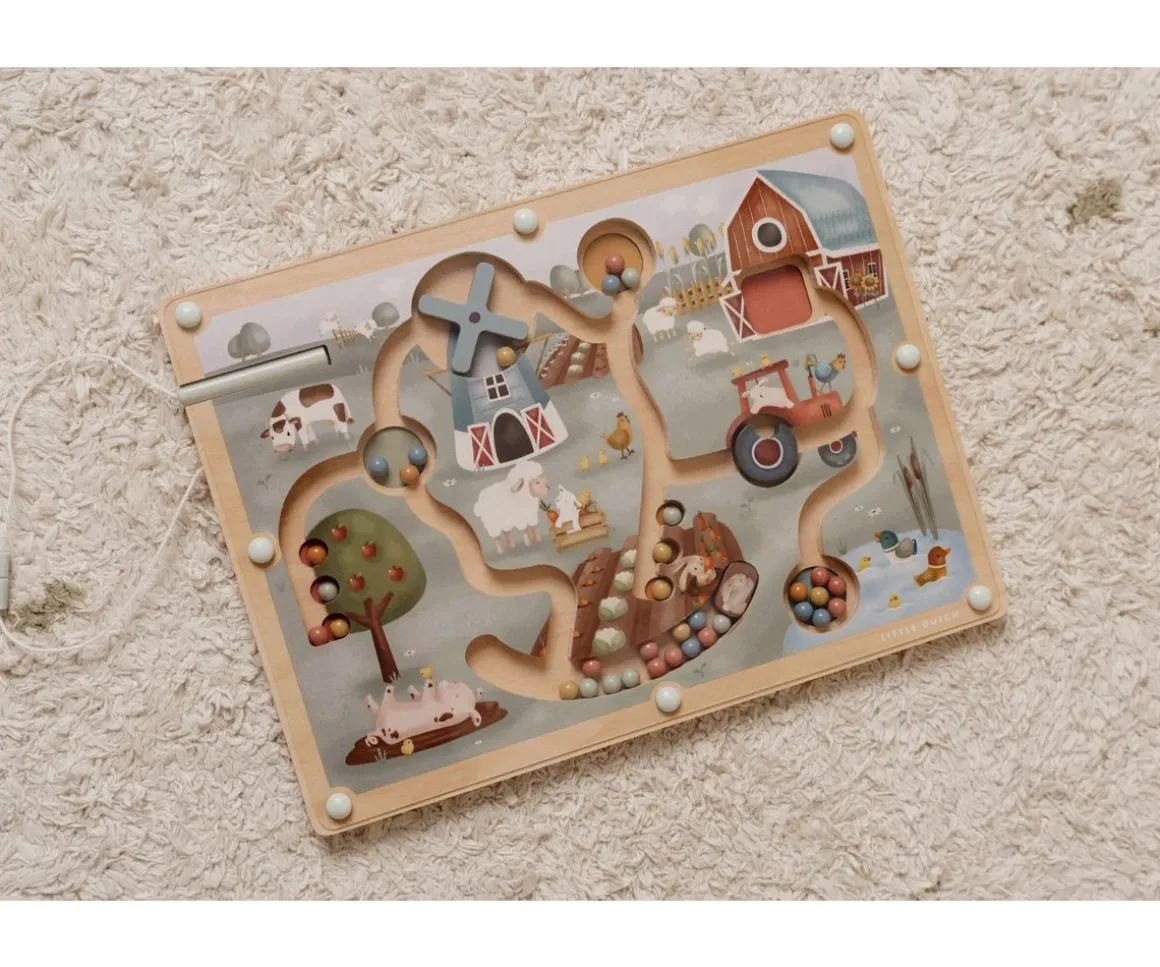 Explora la pequeña granja de Little Dutch con este divertido laberinto magnético.Solo deberás usar el bolígrafo para coger una o más bolas y moverlas por toda la granja.El bolígrafo está unido al panel del laberinto con una cuerdecita y tiene un hueco en el panel para guardarlo.