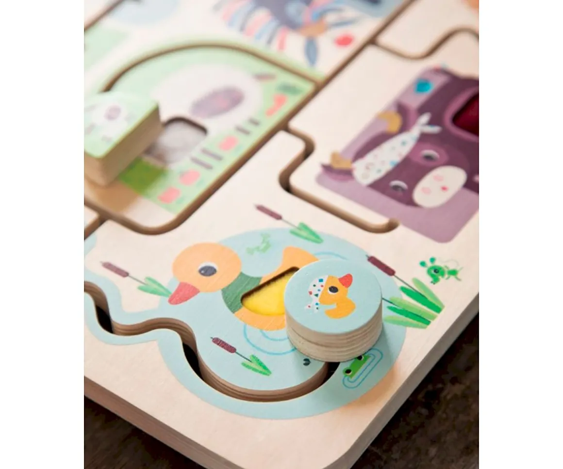 Después de un suave abrazo de mamá y papá, vuelven a jugar. Pero cuidado, cada animal quiere volver a su propio lugar.