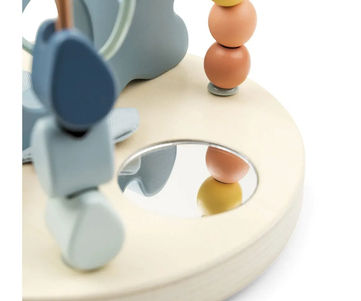 Divertido laberinto de cuentas de madera de la bonita ballena Wally dónde tu peque practicará las habilidades finas y agarre de pinza mientras mueve las cuentas pequeñas. Sus divertidos colores y el espejo que incluye hará que el bebé tenga curiosidad e interactúe con él.