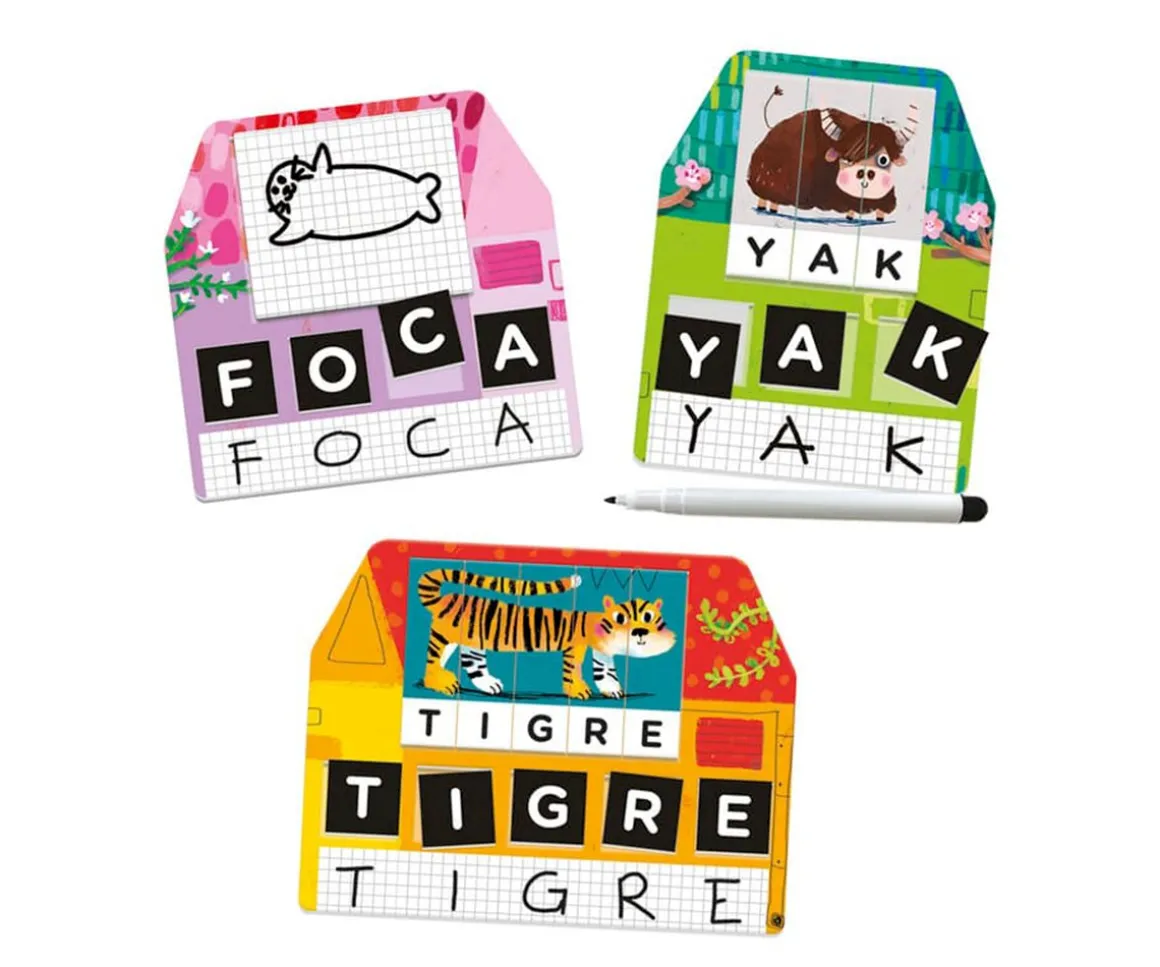 - Incluye: 72 letras, 3 casas, 18 puzzles, 3 mini pizarras blancas, 1 rotulador borrable e instrucciones