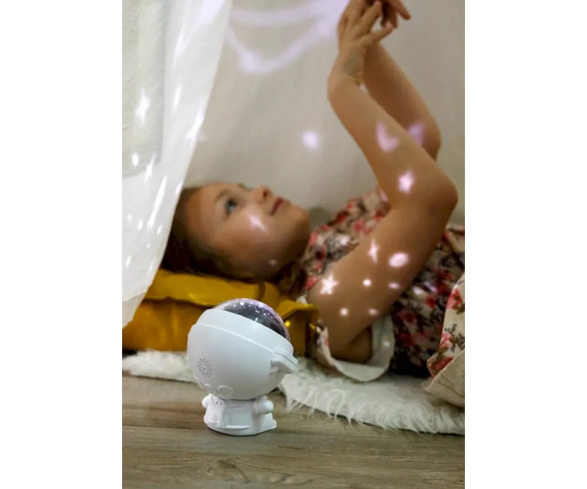 Preciosa lámpara proyector de luz GioStar con silueta de astronauta que aportará una sensación cálida y relajante tanto a peques como a mayores. Con planetas giratorios, estrellas centelleantes y un ambiente marino misterioso, brinda seguridad y tranquilidad en las horas nocturnas. La suave música calma y ayuda a los pequeños a conciliar el sueño.